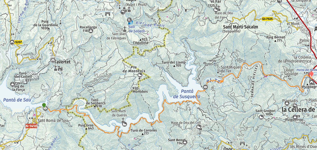 És l’etapa de les preses, perquè anirem vorejant les preses de Sau, Susqueda i El Pasteral. La panoràmica normalment és fantàstica, tot i que enguany pot ser una mica desoladora per la manca d’aigua.